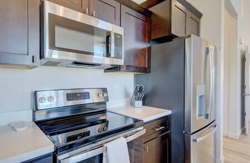 Once inside you will be greeted by the open-concept living, dining and kitchen space. The fully-equipped kitchen allows you to whip up culinary delights with new appliances and ample counter space. The kitchen includes a fridge, dishwasher, range, oven as well as toaster and Keurig coffee maker. The kitchen window will entice anyone in the group to help with the dishes with it’s awesome mountain views. The adjoining dining and living areas allow for the whole group to enjoy each other’s company.