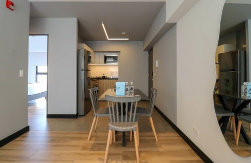 In the welcoming Miraflores neighborhood, this beautiful apartment it's very well located; just minutes away from Larcomar shopping center, Parque Kennedy, Virgen de Fatima Parish, and exclusive gyms. The area has currency exchange services, and labs centers in case you need to take a test, such as ROE and Multilab.