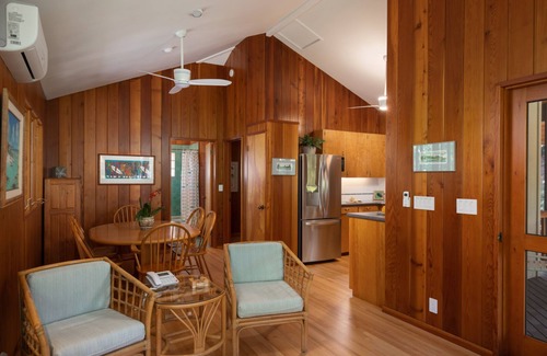 Guests enjoy thoughtful amenities such as a fully equipped kitchen, washer/dryer, high-speed Wi-Fi, an outdoor shower, beach chairs and towels, and a small lawn framed by tropical foliage. While open windows, ceiling fans, and gentle trade winds keep the cottage naturally cool, there is also air conditioning in both the bedroom and main living space for added comfort.