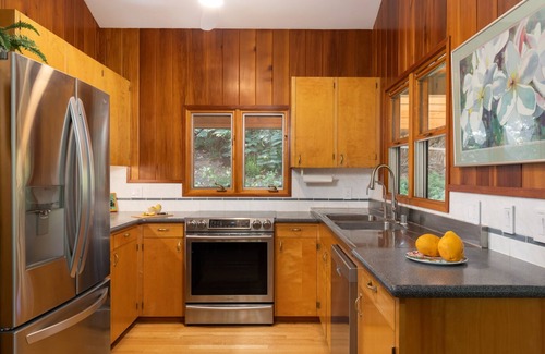 Inside, the cottage features warm cedar paneling, handcrafted oak floors, and generous windows that welcome in the ocean breeze. The main living space is located upstairs and includes a vaulted ceiling, an open-concept kitchen with ocean views, and a comfortable lounge area that opens to a covered lanai—perfect for sipping coffee or watching the light shift over the bay. Also upstairs is the full bathroom with a shower/tub combo. Sleeping accommodations include a private bedroom with a king bed, plus a sofa sleeper in the living area—best suited for children. Please note: Ehu Kai accommodates a maximum of 2 adults and 2 children, making it ideal for a couple or small family seeking an intimate, peaceful escape.