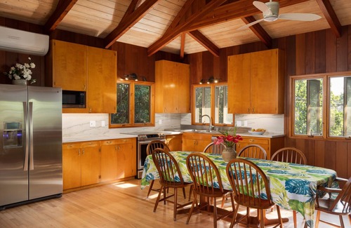 Charming coastal craftsmanship meets serene, private beachfront living. Set amid mature tropical plantings, Ulu Niu offers a tranquil, two-story retreat that captures refreshing coastal breezes in a stylish and intimate setting. The home’s thoughtful craftsmanship shines through oak floors, rich redwood paneling, and custom koa shelving, all complemented by artwork from local artists—creating an authentic and thoughtfully maintained Hawaiian escape.