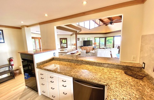 The large (1500 sq. ft.) guest upper floor has a spacious living/dining area with 16' ceilings, beautiful mahogany and leather furniture, and a 65" 4k HD LED TV w/ Netflix. There are two bedrooms with full ocean views, w/ 43" 4K LED TVs, two bathrooms, a full kitchen with an ocean view and new appliances, a laundry room and a very large lanai seating and dining area (balcony/deck) with a fabulous panoramic ocean view. (click 'video' icon in above photo window )