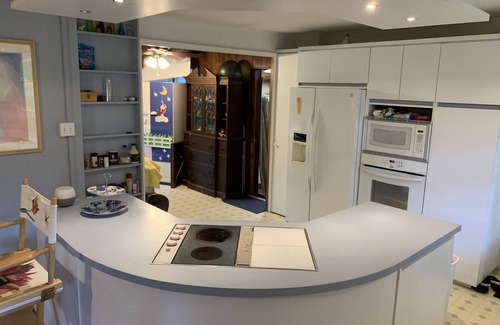 Spacious full kitchen with side by side refrigerator, wall oven, wall microwave and glass top 2 burner in wide custom curved three section island with overhead lighting. Glass lid cookware, complete with asortment of accessories. For times you would like to eat in.
