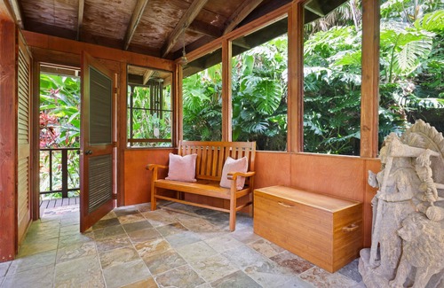 Enjoy all the comforts of home while surrounded by paradise in over 5000 sq. ft. of custom living space—with bamboo hardwood and natural slate floors, travertine bathrooms, granite counters, teak furniture, and our exotic lava-rock bath house—fully off-grid and fed by a waterfall.