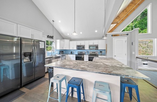 Your experience at Waker’s Paradise will be enhanced by its remarkable amenities. Enjoy the spacious open floor plan featuring three expansive decks that provide panoramic lake and mountain views, perfect for sunset vows. The main kitchen comes equipped with two ovens, two dishwashers, and ample seating for family-style meals, while the lower-level rec room offers entertainment options like a ping pong table and foosball. Unwind in the lighted hot tub or relax on the private dock, which also includes electric outlets and dock furniture, inviting you to savor your time by the water with loved ones.