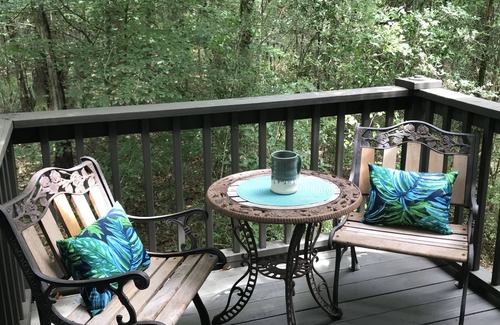 Start your day with coffee or morning meditation from a private deck that sits just off of the kitchen, high among the trees, and overlooks a wooded walking path that winds through the woods along the side of the cottage.