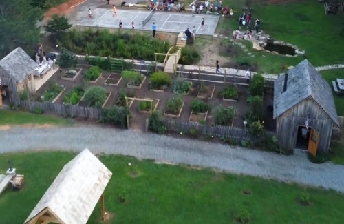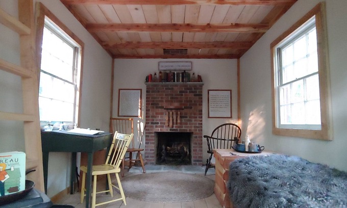 Inspired by Henry David Thoreau's legendary 1845 cabin at Walden Pond, this studied replica was built over 10 months with careful attention to detail, based on communications with the museum curators at Walden Pond in Massachusetts. The cabin's beautiful mix of woods were locally harvested, the nails were blacksmithed to 1850-era specs. Recycled products were used as possible; and historical artifacts, including Thoreau's personal library while he was at Walden, help visitors step back in time. An inside root cellar and front porch cooler provide food storage options.