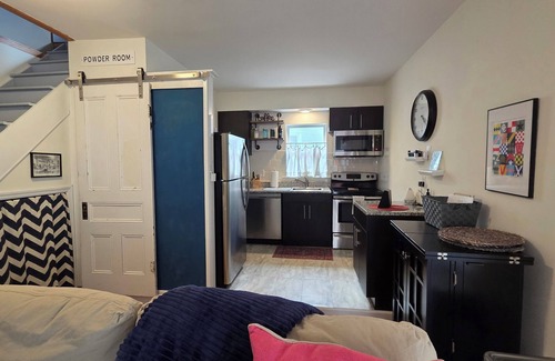 The Kitchen has a dishwasher, microwave, stove and refrigerator. There is a coffee machine but why not wander the neighborhoods and grab a coffee while you explore? We provide a hair dryer, q-tips, cotton balls, towels, bottled water, coffee filters, a few spices and kitchen basics and Alexa. Anything else you may require we can discuss.