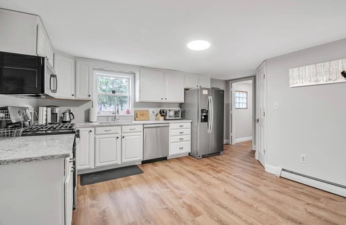 The main floor showcases an open floor plan with a stylish kitchen, an elegant lounge, and a spacious dining table, making it the ultimate hang-out space for your group. The modern yet charming kitchen includes stainless steel appliances, granite counters, and a K-cup coffee machine. It is fully equipped with an oven, stove, dishwasher, and a full-size fridge and freezer. The kitchen is stocked with most essentials, but remember to bring your seasonings and food of choice.