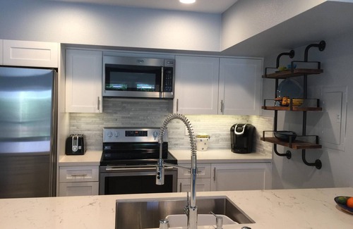 Enjoy the beautiful mountain views from your private patio or living room. BBQ with your NEW propane BBQ. Enjoy the serenity and PRIVACY of your private green space adjacent to the patio. Enjoy the resort caliber pool and hot tub, and be sure to bring your tennis rackets. We supply a pickle ball set. The tennis and pickle ball courts usage is included, & illuminated for night play. This ground floor unit has been COMPLETELY renovated with new quartz counter tops, custom cabinets with soft-close everything, NEW flooring, bathroom and fixtures, kitchen, NEW appliances, including filtered water and ice, BlueTooth Speaker, dishwasher, microwave and Keurig coffees. The unit has central heat and AC, strong extended Wifi, and each of the two TV's are Roku equipped. You have access to a variety of streaming platforms on Roku.