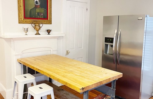 This designer home boasts four generously sized bedrooms and three fully renovated bathrooms, perfect for accommodating your entourage comfortably. The gourmet kitchen is a chef's dream, featuring stainless steel appliances and marble counters, while the dining room showcases a custom-made table crafted from original wood salvaged during renovation, seating up to eight guests. The luxurious master suite on the main level, with a plush king-sized bed and an elegant fireplace, is the ideal spot for brides and their bridesmaids to get ready. Additional features include a glamour bath with a soaking tub, cozy living spaces, and modern amenities like WIFI, cable, and a washer/dryer, all designed to enhance your stay.