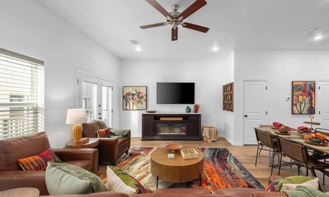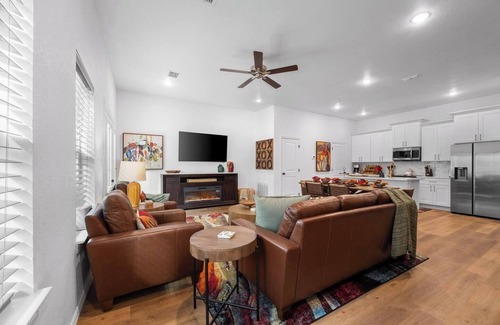 Immerse yourself in the excitement of Arlington’s Entertainment District with this stunning NEW 2-bedroom, 2.5-bathroom townhome, just a short walk from AT&T Stadium, Globe Life Field, and Choctaw Stadium. Accommodates up to 7 guests. Enjoy the perks of a gourmet kitchen, cozy living spaces, WiFi, rooftop deck, and parking. Whether you’re in town for the big game or to experience vibrant city life, this stylish retreat offers the perfect balance of comfort and convenience for a memorable stay.