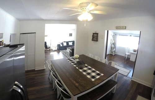 FLOOR PLAN LAYOUT & AMENITIES: Spacious 4 bedroom home with central air conditioning and heat so it's perfect for every season and has plenty of space for everyone to enjoy. The kitchen has quartz counters, huge stainless farmhouse sink, new stainless steel appliances, Keurig and regular coffee maker, tea pot, crock pot, mixer and a large farmhouse table - dining for 14 and is also great for entertaining. Living area has a farmhouse fireplace, a 55-inch smart tv (pulls out & rotates so you can see it from the kitchen, the front porch area and the deck), cable, DVD player, stereo, WiFi, games and a slider to a large front deck. The front porch offers a checkerboard table and foosball coffee table. Roku tv's in the king bedroom and the bunk room. Two full bathrooms, newly updated. Laundry room with new washer and dryer.