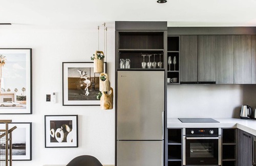 The Beach Lodge casual living room captures the essence of warm and cosy interiors with features designer décor throughout. A large Smart TV where guests’ can access their own Netflix. A sound bar is also provided for your entertainment. The open plan living room, dining and kitchen has reverse cycle air conditioning. A glass sliding door from the lounge open to extend your living area to an outside deck with bar table for a sunset drink before dining at one of Noosa’s iconic restaurants. The kitchen features one long bench top, dishwasher and a Nespresso machine.