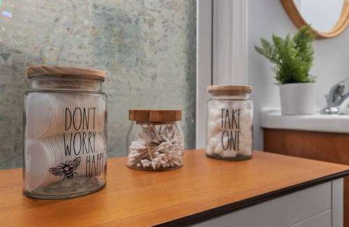 Walking up the spacious staircase, you will find a nice landing area which takes you to two delightful bedrooms that have queen and full beds. Both bedrooms have comfortable bedding and Smart TV’s for all of your streaming needs. All TV's are equipped with Netflix accounts, there is no cable TV available at this property. There is also another bathroom upstairs.