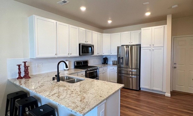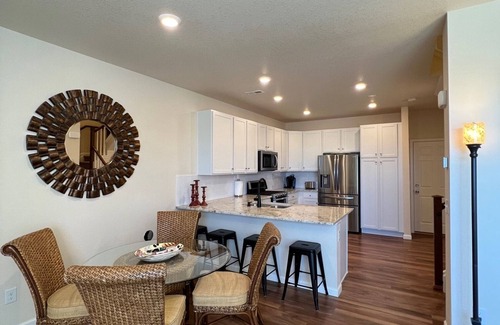 Fully furnished. All modern appliances, washer & dryer laundry room with attached 2 car garage. Dishes, pots and pans everything you need for cooking in this spacious all granite kitchen. Kitchen has built-in desk area with granite countertops as well. Plenty of storage and large pantry. Primary bedroom has a comfy queen bed and large ensuite with soaking tub and walk in closet. 2nd bedroom has full bed perfect for our younger guests.