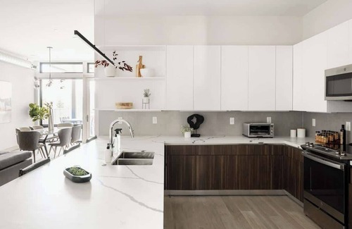 Your experience at the condo is elevated by its impressive amenities. Featuring a fully-equipped kitchen, a stylish dining area that comfortably seats up to 10, and contemporary living spaces infused with tranquil decor, every detail is designed for comfort and convenience. Each bedroom is equipped with work-from-home spaces, smart TVs, and luxurious bedding to ensure relaxation between celebrations. For larger gatherings, inquire about renting the rooftop space, offering breathtaking views that make for perfect wedding photography. Street parking and a limited number of garage spaces provide flexibility for your wedding party and guests.