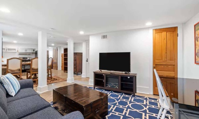 This bright and freshly renovated 1-bedroom, 1-bath home is open and welcoming, with plenty of space to relax after a day out in the city. The living room flows easily into the dining area and fully equipped kitchen, all filled with natural light. Guests will enjoy convenient touches like a washer and dryer, high-speed Wi-Fi, central heating and A/C, and a large tiled walk-in shower—perfect for unwinding after exploring New Orleans.
