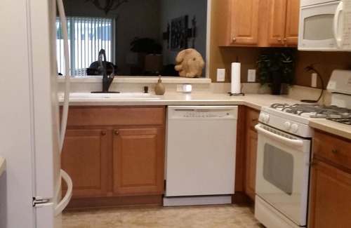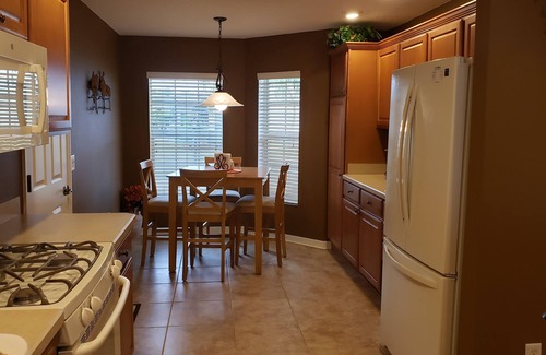 Your stay includes all linens, bath and pool towels, hair dryers and a fully stocked kitchen for all of your cooking needs. The kitchen includes a breakfast nook and there is also a separate dining area.