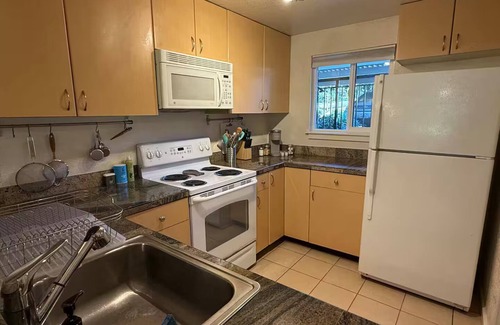 The kitchen is stocked with cooking utensils (salt, pepper, and cooking spray provided). There is a dishwasher, microwave, oven, stove, and fridge/freezer. Please use the dishwasher gel provided under the kitchen sink to run the dishwasher, if you use it.