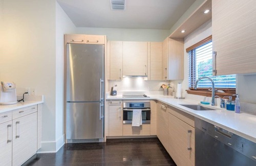 This is a downstairs end apartment with a back door that opens directly onto the pool deck near the hot tub. The apartment has wood floors, high ceilings, great furniture, fixtures and finishes and the kitchen has everything you need to prepare meals etc.