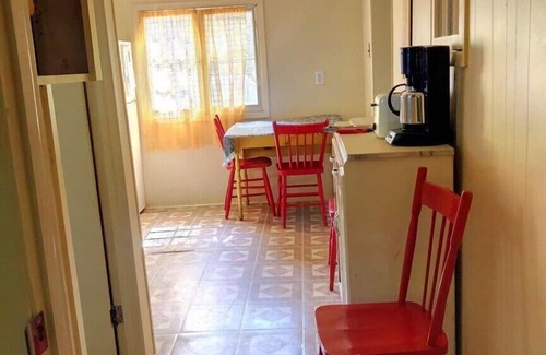 With a private beach across the street, , Doctor's house is a basic, rustic, 2-bedroom cabin with a queen bed in one room, one twin plus double in the other, and a pull-out couch in the living room. It has a full eat-in kitchen as well as a private deck. There is a three-piece bathroom with toilet, vanity sink, and a basic aluminum shower.