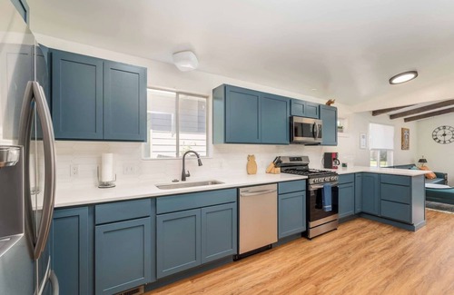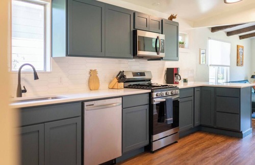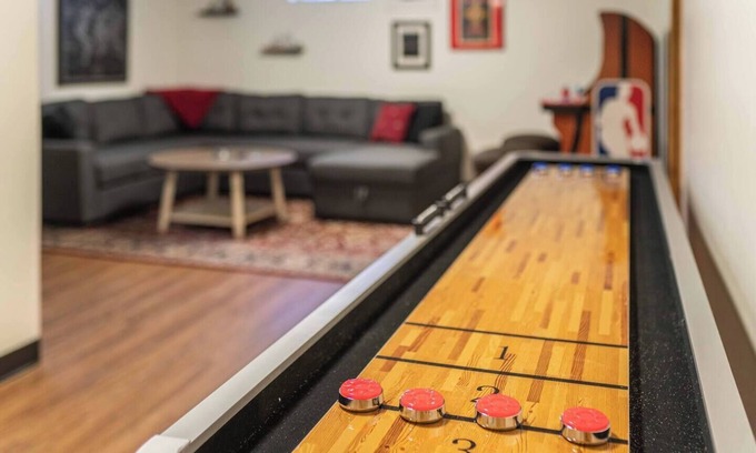 The fully equipped kitchen features luxury finishes, brand new stainless steel appliances and a large dining table! The upstairs living room offers a fireplace and plenty of seating for the whole family to enjoy. Downstairs you will find another living room with ample seating, a large flat screen TV, shuffle board, a poker table, arcade games, and bar! This home is fully stocked with paper towels, toilet paper, shampoo, conditioner, body wash, hand soap, dish soap, and detergents - laundry and dishwasher, as well as bed linens and towels. In addition, the kitchens are stocked with cookware, bakeware, dishes, glasses, utensils and standard small appliances. Please note that the use of stairs are required to access the downstairs portion of the home. The backyard is NOT fully fenced in. Pets are NOT to be left unattended unless crated.