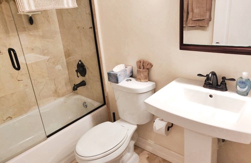 The space is a comfortable two-bedroom unit located on the second floor of a small apartment community with courtyard and pool. Features a large kitchen with granite countertops and an old-world aesthetic, equipped with gas range, French door refrigerator, dishwasher, microwave, coffee maker, toaster, and all utensils and cookware needed for preparing light meals. Living space features large table for dining or working on laptop, a cozy, oversized sofa for relaxing after a long beach day, and TV with Netflix (cable not available) and Blu-ray player. Two light-filled bedrooms at the back of the unit each contain a queen-sized bed. Unit has two full bathrooms (master bathroom is en suite and has a shower/tub combination; second bathroom is located in the hallway and has a walk-in shower). An in-unit washer and dryer are free for guest use.