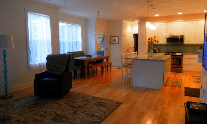 1st floor and 2d floor master bedrooms/baths with king beds, one bedroom with queen bed, one bedroom with double bed and single bunk bed over, moveable hassock bed in a box on wheels that can be used anywhere upstairs. Hall bath upstairs, washer/dryer, outside shower, front porch, large screened porch off kitchen, gas grill. Central air and ceiling fans. Ultra HD flat screen in living room and 4 flat screens in bedrooms. High chair and full size moveable crib.