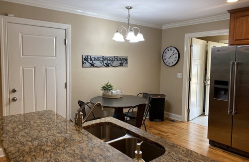 The home contains a generous living room with not one, but two large leather sofas - both of which include recliners. For some downtime relaxation, enjoy family favorite games, crayons and paper, all stocked in the living room game cabinet. Guests will enjoy a lovely kitchen with granite counter tops, stainless-steel refrigerator / appliances, dishwasher, and other appliances to make meals a breeze – including a Keurig coffee maker, toaster, blender, crockpot, and an array of pots and pans. And, whether you’re enjoying a takeout meal from the many local restaurants or cooking a meal yourself, the kitchen is stocked with many basics to make grocery shopping less stressful.