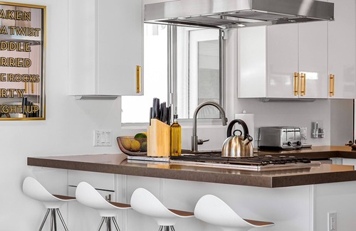 All of the bedrooms feature a comfortable hotel-quality mattress, ample storage, and a flatscreen TV. The deluxe Primary Suite is gorgeous with its King bed, colorful wallpaper, en suite bath - with dual sinks and stunning tilework - as well as direct pool access. Guest Room 1 has a King bed, beautiful wallpaper, and easy access to a shared hallway bathroom. Guest Room 2 features a Queen bed, direct access to the shared hall bathroom, and its own private outdoor seating area.