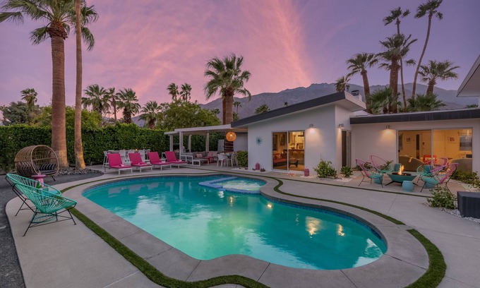 Beyond the whimsical pink front door, you’ll find a vacation paradise full of vibrant colors, fun wallpaper, fab decor, and unique artwork. This home has been perfectly planned for spending time with your entire group - or stealing off for some alone time to curl up with a good book. Fabulous Hollywood glam meets the comfort and laid-back vibe of a family home. The entire property is very livable - the type of place where you can put your feet up, relax and not worry about a thing. The owners have put a lot of themselves into creating the perfect vacation paradise and are thrilled to be able to share it with people who love Palm Springs as much as they do!