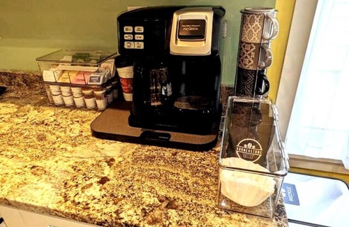 Start your day with local coffee or K-cups, or enjoy a kettle and tea on the bistro table on the private lawn under a shade umbrella.