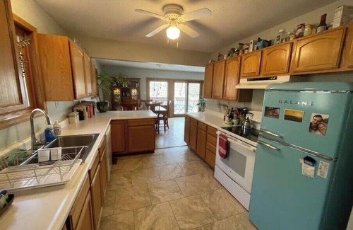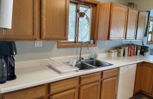 Guests have access to most of the house (we keep a few rooms locked with our personal belongings since this is our home). Two bedrooms with full beds are on the top floor with a shared Jack & Jill bathroom. We can accommodate two additional guests in the "relax room" on the main floor, where we have a sofa bed. The kitchen is fully equipped for cooking. There's a full bathroom on the main floor.
