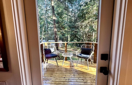 Both the upstairs and downstairs bathrooms have modern features, high-end toiletries, and luxurious linens. The bedrooms are comfortable, both with cozy reading nooks, luxury sheets, and views of the cedars surrounding you.