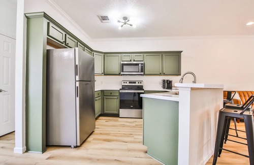 Beautiful condo walking distance to Texas Tech University! It is located in a gated complex with covered parking and is the perfect spot to stay for all your Tech events. Easily walk to restarurants, coffee shops, and popular night spots. The master bedroom has a king bed with en suite bathroom, and the second bedroom has a 2 queen bunk bed and en suite bathroom. It comes with a fully stocked kitchen and has all the essentals to make your stay comfortable and easy. Entry requires stairs. Home is located on 2nd and 3rd floors with private ground level entry.
