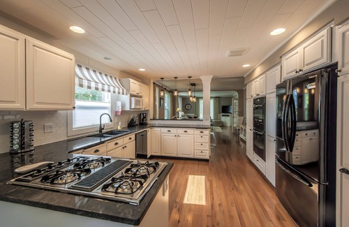 Vacation in a lovingly remodeled home with an open floor plan and a fully equipped gourmet kitchen. Dining in? Enjoy a breakfast nook, dining table which seats 6, or sit at the eating bar. The three bedrooms each have en-suite bathrooms and there is an additional guest bath on the main floor. Luxuriate in the king bed in first floor master bedroom, or indulge yourself in one of the two queen bedrooms upstairs. Entertainment amenities include a Smart TV with Netflix and Pandora, WI-FI and 100+ cable channels, games and books. The inviting deck in back yard will draw you outside to enjoy the beautiful spring weather. Two off-street parking spaces are provided and a laundry room is conveniently located on the first floor for your use.