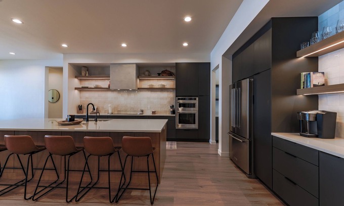 The gourmet kitchen and large dining area invite shared meals and cozy storytelling evenings by the fireplace.