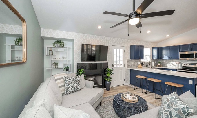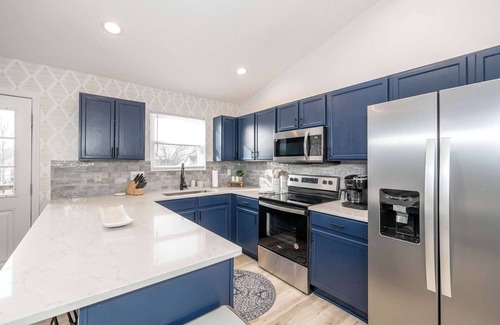 The home’s bright and fresh interior is adorned with contemporary furnishings set against modern décor, creating spaces as suitable for relaxation as they are entertaining. Kick up your feet on the plush living room sofa as you stream a movie or episodes of your favorite shows on the mounted smart TV. The centerpiece kitchen showcases stainless steel appliances, glossy stone counters, and striking deep blue cabinetry stocked with all the conveniences of home. Gather for meals together at the sophisticated dining room table with seating for 10 or enjoy meals at the go perched up at the counter with high-top stool seating for 3. Pool sharks and beginners alike will want to make their way to the garage-turned-game room, where a pool table awaits to host hours of competitive fun.