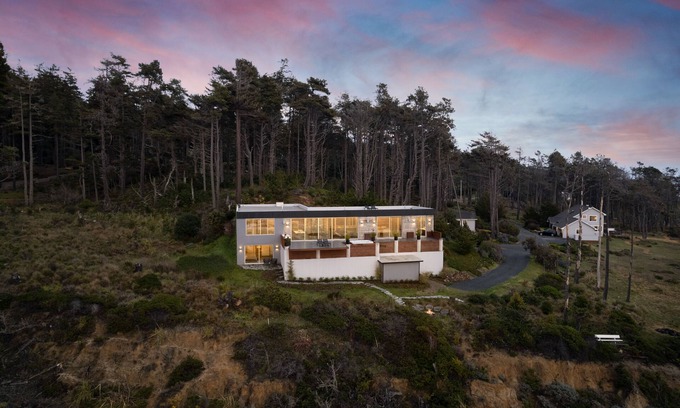 Wander Anchor Cove is a modern concrete, glass, and steel home with floor-to-ceiling windows set on 5.25 acres overlooking our own private cove with over 1,800 feet of ocean frontage. This incredible coastal escape overlooks rock formations and islands where you can enjoy the sunset and whale-watching views year-round from the 6-person hot tub, or permanent bench on the bluff top.
