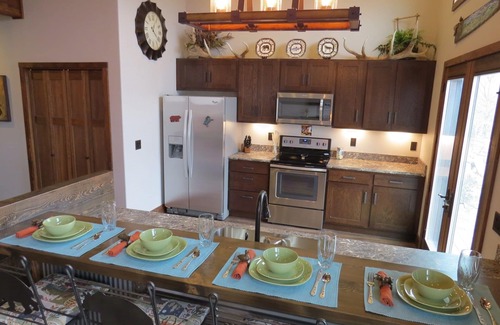 KITCHEN: The kitchen, dining and living areas of the cabin are all one big room, which gives the cabin a very homey feel. The kitchen is equipped with an electric range and oven, refrigerator, microwave, and all the necessary cookware. The kitchen island seats four comfortably and a BBQ grill and deck seating is provided for outdoor meals.