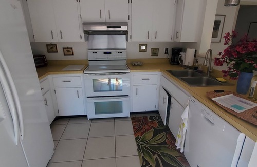Beautiful late 70's home with primary bedroom suite and bath, and guest bedroom with adjacent bathroom. Large fenced yard invites you outdoors from enclosed lanai. Adorable combined kitchen and dining room are perfect for gatherings around meals. Bright comfortable living room with contemporary furniture and lighting. Washer and dryer included. Both master suite and guest bedroom have queen beds and the sofa has a queen sized pull out bed.