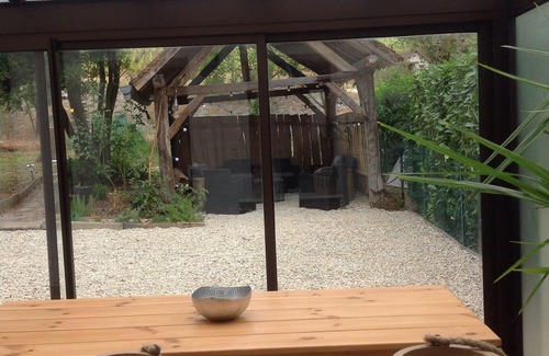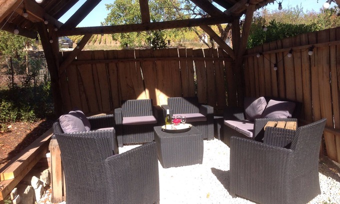 Garden (300m2) with view on the vineyard, summer living room covered with its plancha.