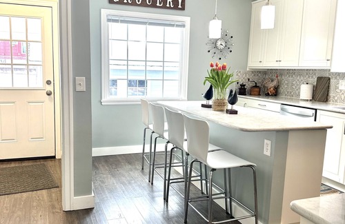 New kitchen with large Island that seats 4, stainless appliances, blender, toaster, Electric skillet, Keurig and drip coffee maker. Kitchen supplies dishes and silverware, baggies, foil, Saran Wrap, condiments, paper products, spices, oil, everything you need to bake your favorite dinner.