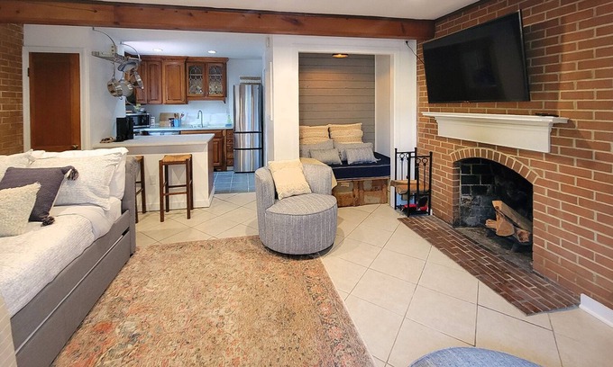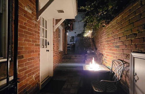 Located in the heart of Old Town Alexandria, ground level. One of two apartments that make up the carriage house on this 1700’s era historical property. This unit has a full kitchen and a washer/dryer, large smart TV, and an adorable, comfy reading nook. Updated appliances along with a small electric fireplace for ambiance (not wood due to guest safety) provide for a wonderful stay in Old Town on the oldest functioning property in Old Town, dating back to 1750. The charm and location are incomparable.