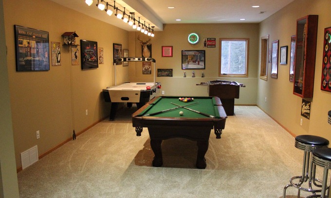 The property is nestled on a wooded lot, spacious open floor plan lower accommodations with separate entrance. Fully equipped kitchen, rec room houses arcade console, pool table, foosball table and a hockey table. Living room has satellite television and wi-fi included. Queen size bed in bedroom and 2 queen sofa sleepers in living room that house children well.