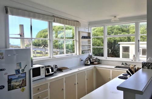 A 1970s crib that has been extended over time, resulting in a quirky layout with three interconnected bedrooms that come off the lounge (no hallway), and is most suitable for families or close friends.