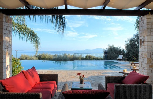 Outside, an attractive shaded al fresco dining area is complemented by a fully-equipped outdoor kitchen next to the barbecue all under a shaded pergola. We don’t think you will be able to drag yourselves away from this love spot! The scene is completed by an exceptionally large horizon pool with a small shallow childrens’ section and a further shaded area behind the villa which houses a table tennis. Additional children's play facilities can be found on the grass by the pool. The views along the entire coastline, across to Albania and down to Corfu Town, are simply stunning at all times of the day and can be enjoyed from all the main areas of the house and terraces. The grounds feature paths for exploring and many fruit trees from which you can pick and sample delicious fruit - Quite simply an excellent villa that seems to fulfil most peoples’ expectations and exceed many!