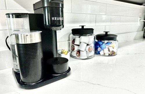 Inside, there are three bedrooms, each with a smart TV (Roku included), two full bathrooms, and a half bath. The fully equipped kitchen includes a Keurig coffee maker and all necessary essentials for cooking and entertaining. A private office with scenic views and WiFi makes remote work convenient.