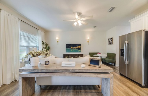 The cottage is equipped with modern amenities, including air conditioning, WiFi, a washer/dryer, and a dishwasher, as well as a hairdryer and essential kitchen and shower supplies. Enjoy the serene front porch, complete with seating, or watch your favorite shows on the TVs in the living room and the master bedroom.A blow-up mattress is also available.